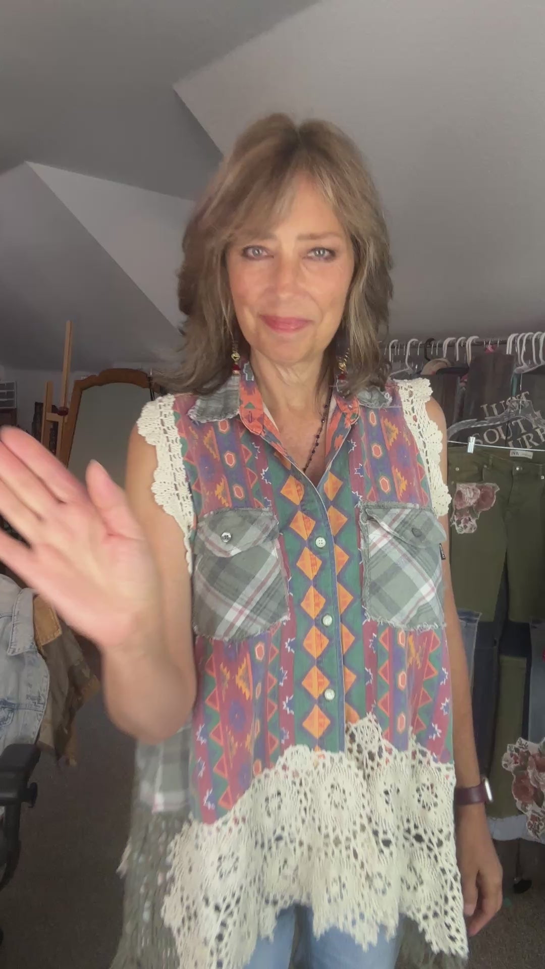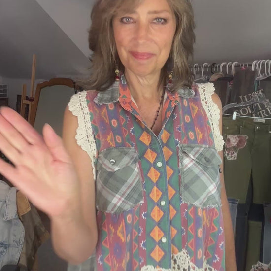 This up-cycled denim vest is in muted fall colors and the design lends itself to the southwest. I gave it an A-line frame by adding the sleeves of a flannel shirt into the side seams. Beautiful up-cycled cotton lace taken from vintage table cloths and a thrifted shirt line the entire bottom of this funky boho vest.