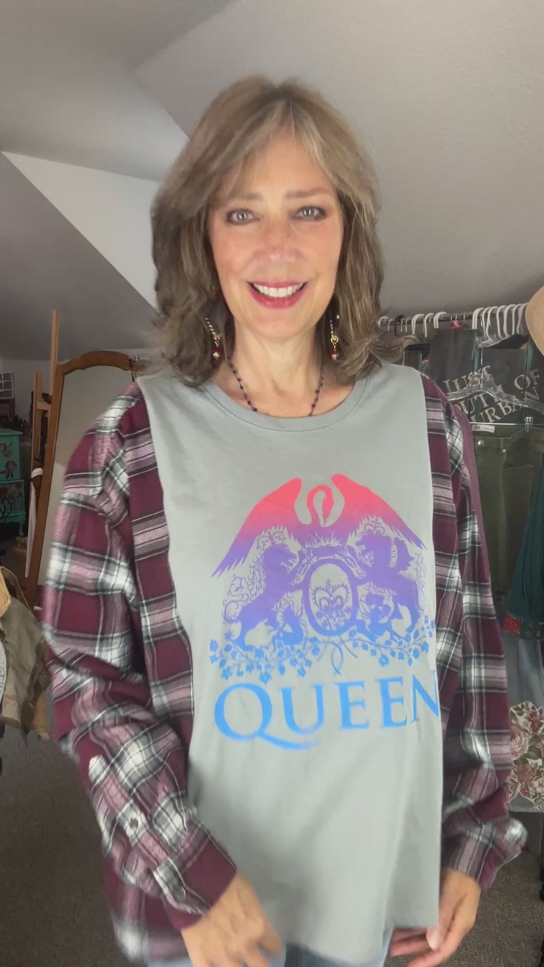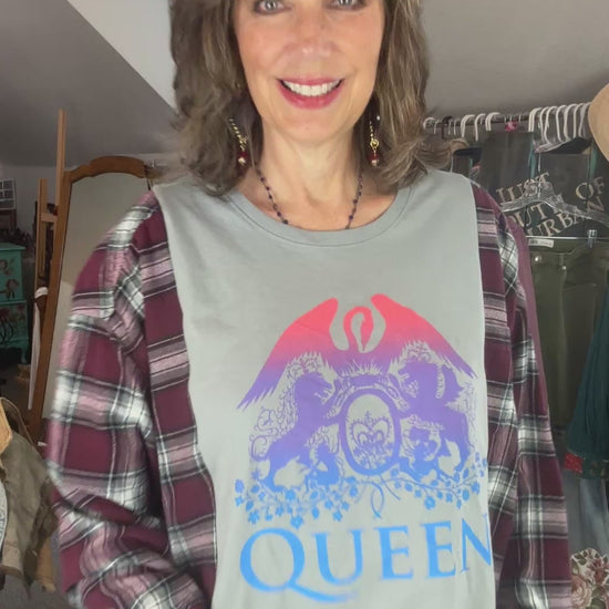 Super fun fall fashion! I have combined a Queen T with a burgundy plaid flannel shirt. Perfect for everyday shopping, outdoor fall play, football games and fire pit evenings. Pull over makes it easy on and off, just grab and go.