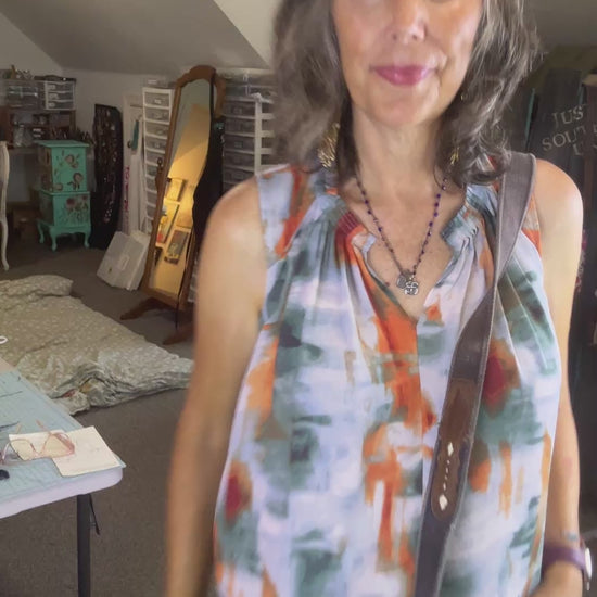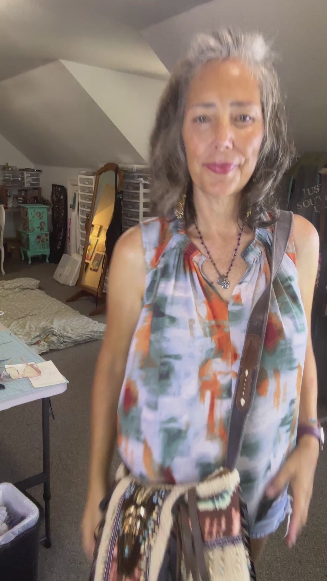 What do you get when you put together a cheetah print sweater, a velvet beaded skirt, embossed faux leather from the fabric store, a tie-dyed beaded blouse, two men's canvas belts, sari ribbon, a faux suede button down top, a faux shearling coat and a couple of boot pulls off of Justin Cowboy boots? Well sometimes you get an outfit, but in this case you get a boho hippie cross body bag!