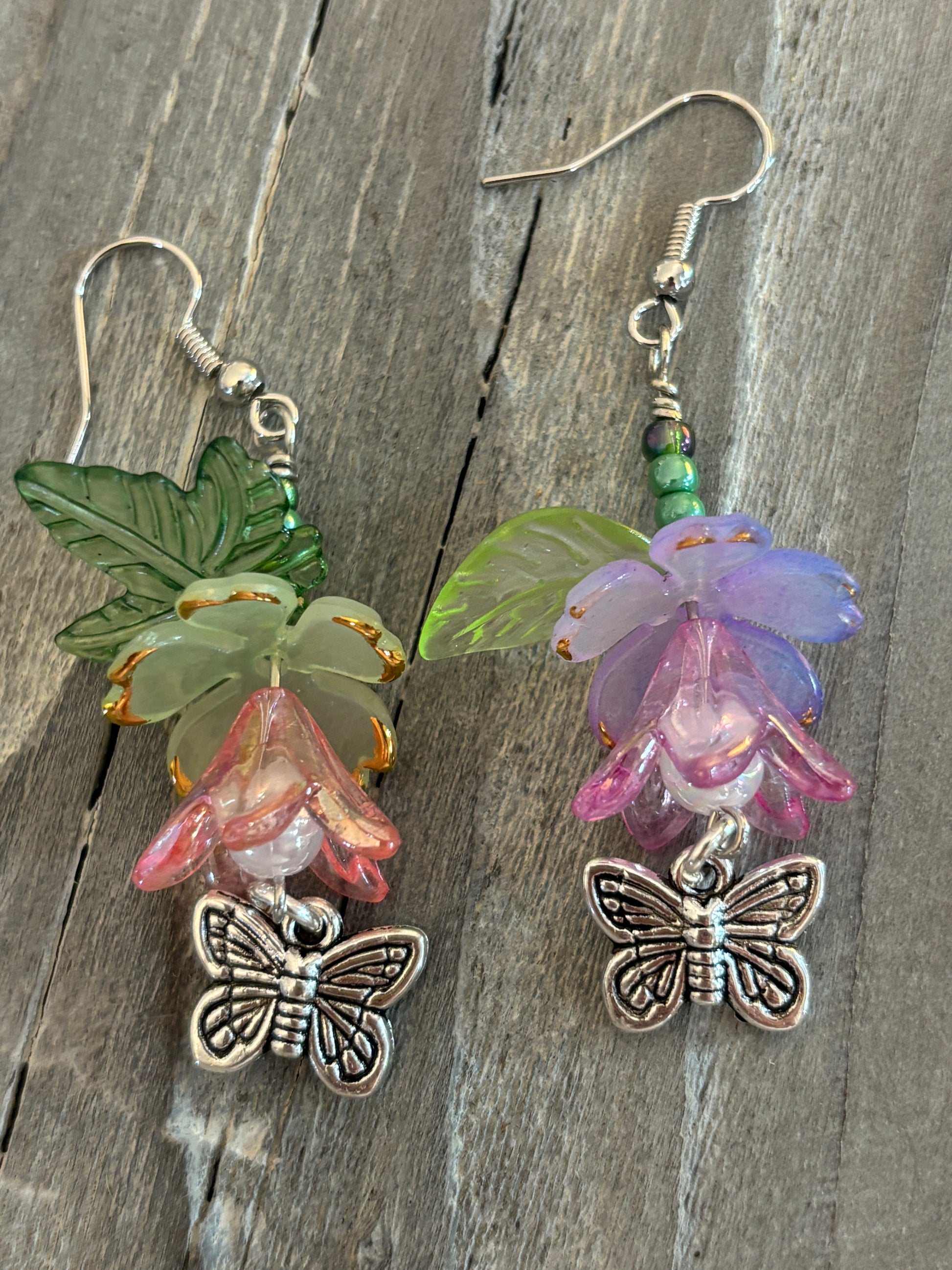 These whimsical floral earrings feature delicate silver-tone butterfly charms that dance with every move. Crafted by hand in soft, cheerful spring hues, they're light enough to wear all day without fatigue. Each pair is uniquely made, so you're getting a one-of-a-kind accessory that brings a touch of nature-inspired charm to any outfit.