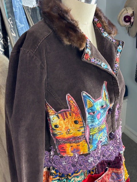 This one-of-a-kind jacket transforms vintage corduroy into wearable art. Whimsical cat appliques dance across the fitted bodice, while a luxe mink collar adds unexpected elegance. The flared skirt showcases intricate Kantha quilting layers, and repurposed purple-dyed wedding lace peeks through adding to it whimsey. Cheerful mismatched buttons replace the original drabs, perfectly capturing the jacket's fun-loving spirit. A true celebration of sustainable style with serious personality.