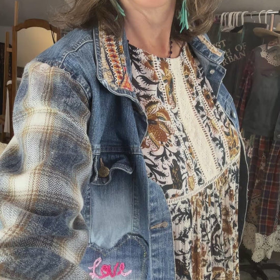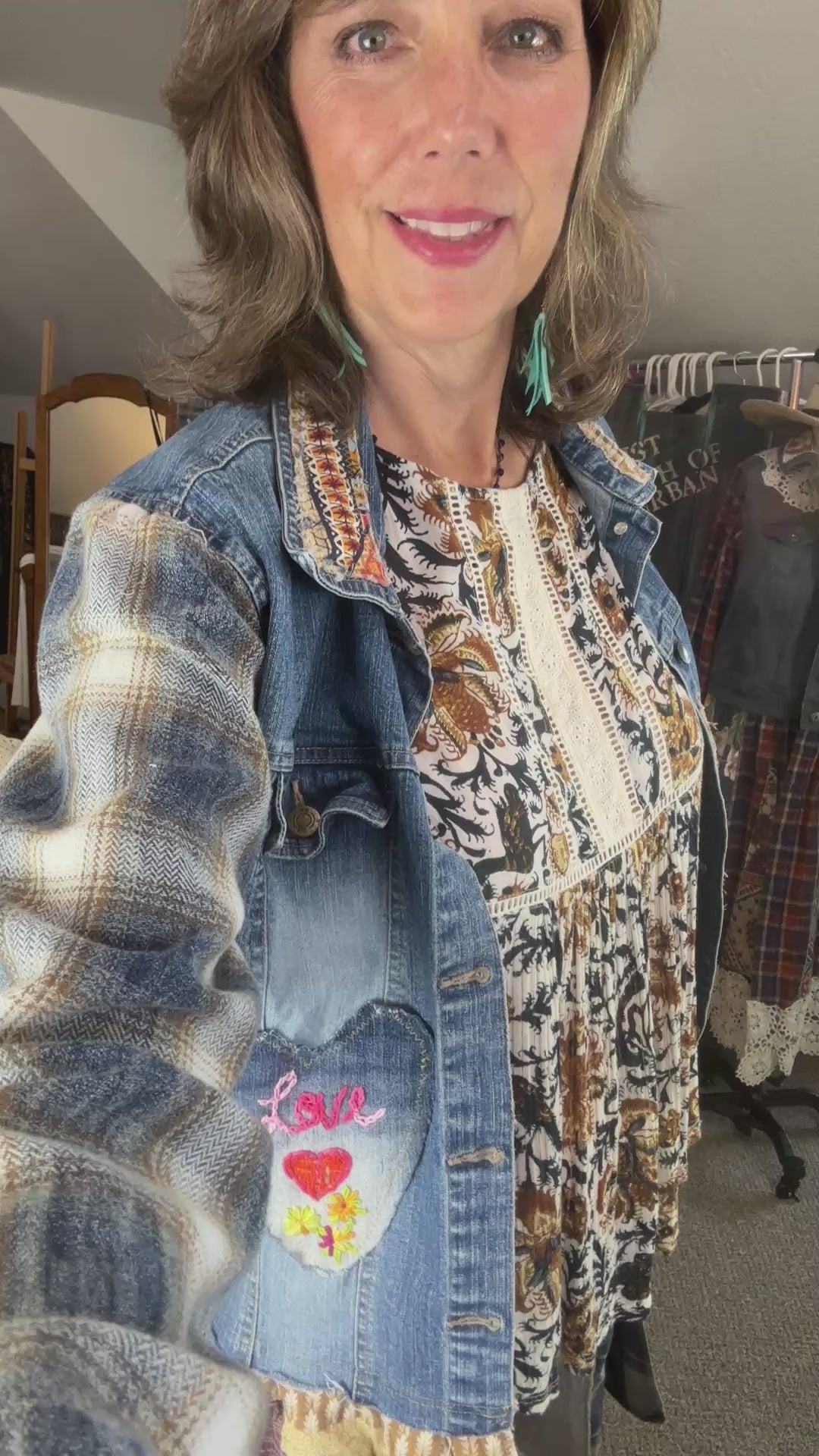 Super fun up-cycled denim duster jacket for Fall. Adorned with a bright retro advertising "Sweet Peas" on the back, an array of fabrics, men's shirts and lace to give the jacket a playful length. Hand embroidered "love and heart" patch on front. Perfectly fun duster for Fall Farmers markets, events, and just running around town.