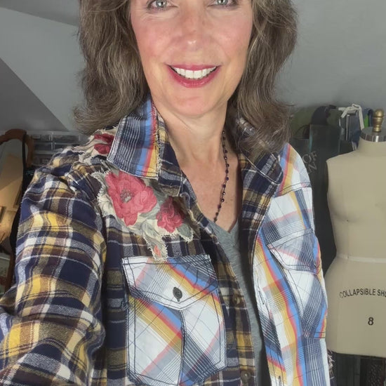 Up-Cycled Flannel Shirt, Blue, Orange, White, Yellow, Women's Size L, JCrew Flannel